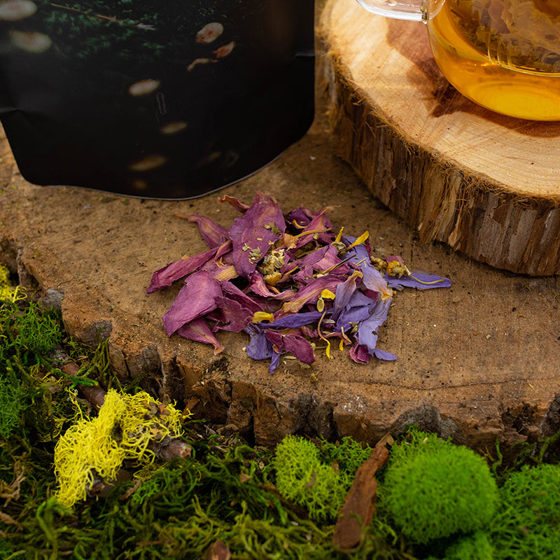 Ingredients: Chamomile, passionflower, orange peel, damiana, red lotus, blue lotus, valerian, mugwort